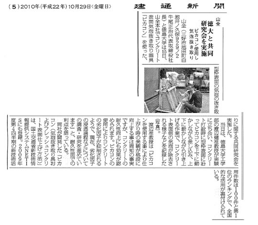 山全と徳島大学は15日、山全本社でコンクリート表面気泡抜き取り器具「ピカコン」を使った、型枠表面の気泡の抜き取りに関する共同研究会を実施した。…