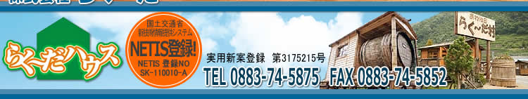 らく~だハウスは、グループ会社で土木工事を行っている株式会社山全が、 工事のときに伐採した木材(杉)や、地元三好市の杉の間伐材を有効活用して作られているログハウスです。 ログハウスの特徴として、湿度の調整がとても優れており、また木の断熱性の高さから夏は涼しくて冬は温かいということが挙げられます。また、コンクリートなどに比べて感触が良く、木の温もりを感じることができるなどの特徴もあります。 ログハウスというと、「丸太組み工法」といって、一般的には丸太を横に組み合わせたイメージを持たれる方が多いのですが、日本古来の在来工法と同じような「軸組み工法」も存在します。 らく~だハウスの構造は、軸組み工法を採用しているとともに、柱や梁は鉄骨なので、 とても頑丈です。