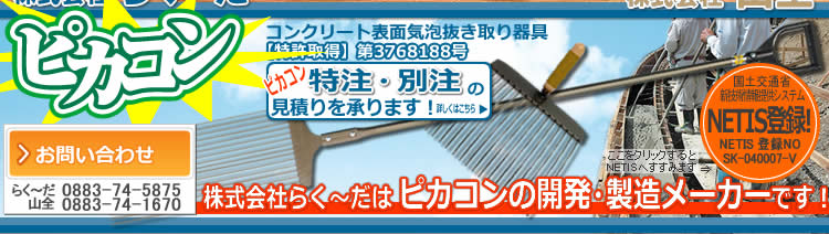 | ピカコンの開発・製造メーカー 株式会社らく~だ コンクリート表面の気泡が減少! | お問い合せ | サイトマップ |