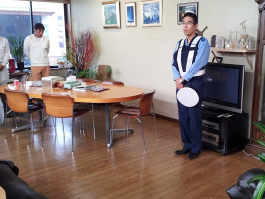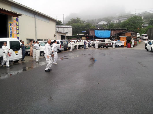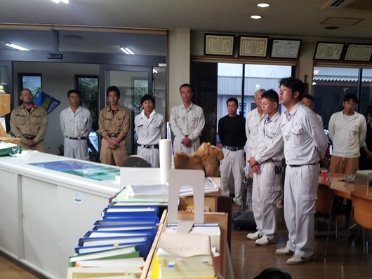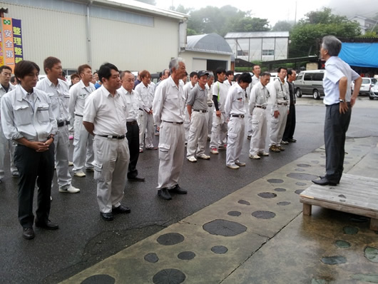 今月も9月2日に実施されましたが、ラジオ体操、社長の話し、各作業現場の安全に関する注意事項の発表に引き続き、三好警察署の石田交通安全課長においでいただき、徳島県のせ―フティラリーの説明や交通安全に関する最近の情報などの貴重なお話をしていただきました。