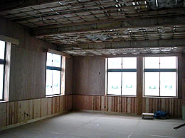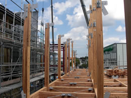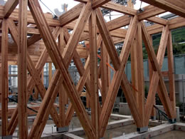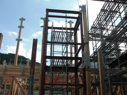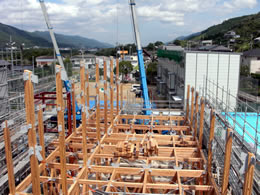 地産材料である地元杉材をふんだん使用した木造大断面施工の小学校、安全第一で完成を目指します。