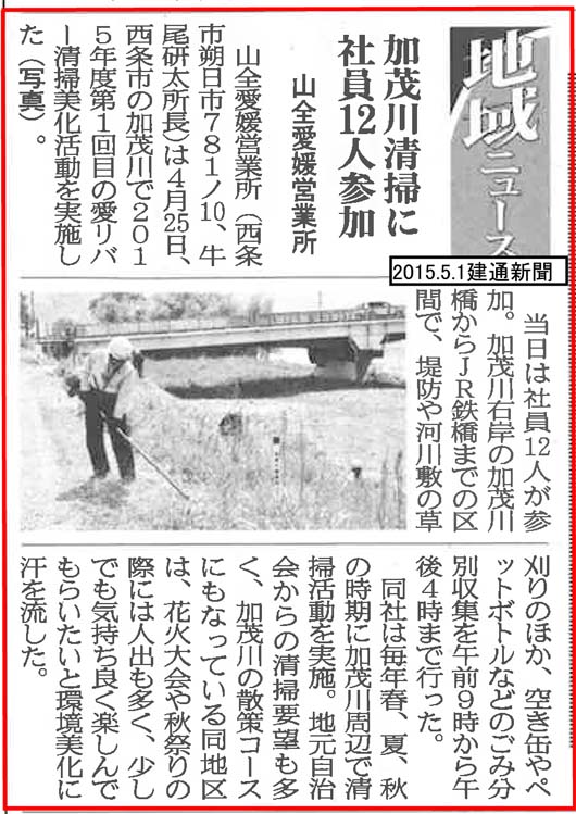 平成27年4月25日、愛媛県西条市の加茂川地区において、2015年度1回目の「愛リバー清掃美化活動」を実施しました。