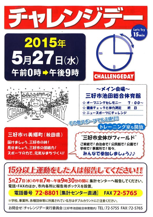 平成27年5月27日、三好市で実施されたイベント「チャレンジデー」に弊社も参加し、午前7時20分から約30分間、会社周辺をウォーキングしました。誰でも気軽に参加できるので、健康づくりや地域活性化のきっかけづくりに最適です。