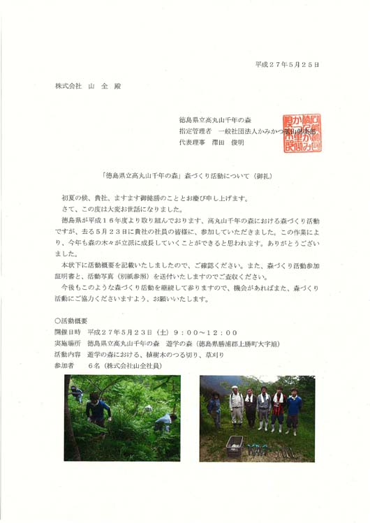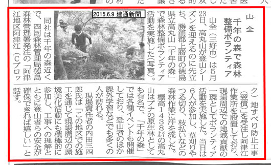 平成27年5月23日、徳島県勝浦郡上勝町の「徳島県立高丸山千年の森」において、これから本格的に登山シーズンを迎えるのに先立ち、森林整備ボランティア活動を実施しました。