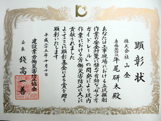 2013年10月10日に、新潟朱鷺メッセで開催されました「第50回全国建設業労働災害防止大会」にて、弊社が開発したセーフティガイドレールが、立坑掘削作業の安全対策に極めて有効であるということで、顕彰基金による顕彰の最優秀作品として表彰して頂きました。