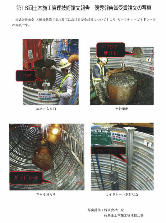 全国土木施工管理技士会連合会が発行しているJCMマンスリーレポート(2012.9月号)に、第16回土木施工管理技術論文報告で優秀報告賞を受賞した弊社の「集水井工における安全対策について」(大岡氏執筆)のセーフティガイドレールの写真(4枚)が特集されています。