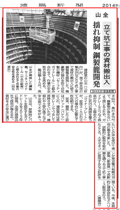 H26.9.20 徳島新聞朝刊の記事に弊社のセーフティガイドレールと組み合わせて資材を安全に立坑内に搬出入を可能とした鋼製篭の記事が掲載されました。