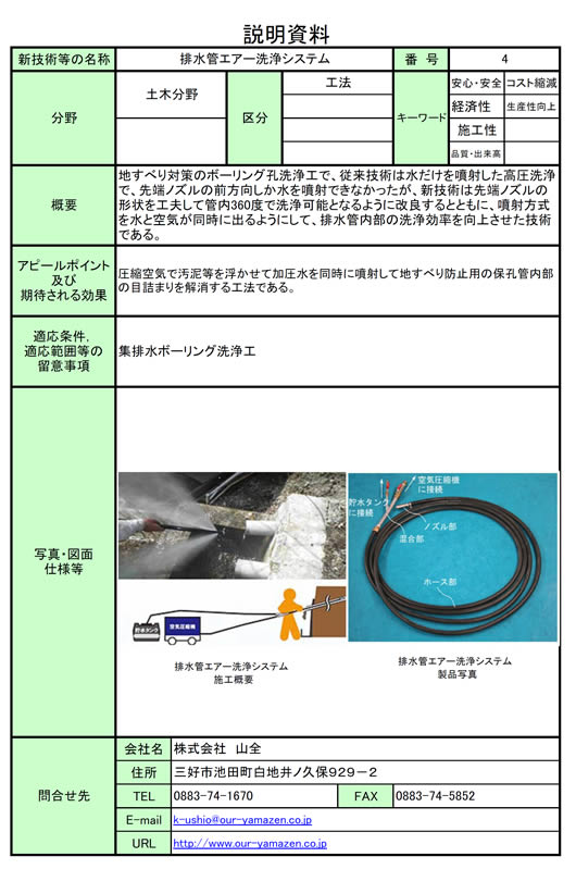 【株式会社らく~だ】 ピカコン|らく~だハウス|イーヤマ処理場|会社概要|リンク集|サイトマップ|お問い合せ|HOME 【株式会社山全】土木工事|建築工事|地すべり工事|保有機械|社会貢献|保有資格 | 表彰工事一覧|メディア情報 土木施工技術論文|県産スギ型枠使用の取組|安全教育|セーフティガイドレール|排水管エアー洗浄工|アスコ処理場|会社概要 |
