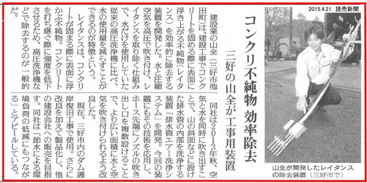 平成27年4月21日の読売新聞朝刊に、弊社の新技術として開発を進めてきました排水管エアー洗浄システムの改良モデル「レイタンス洗浄装置」が掲載されました。