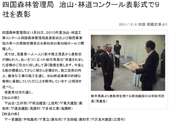 2010年度治山・林道工事コンクール四国森林管理局長表彰式があり、