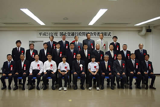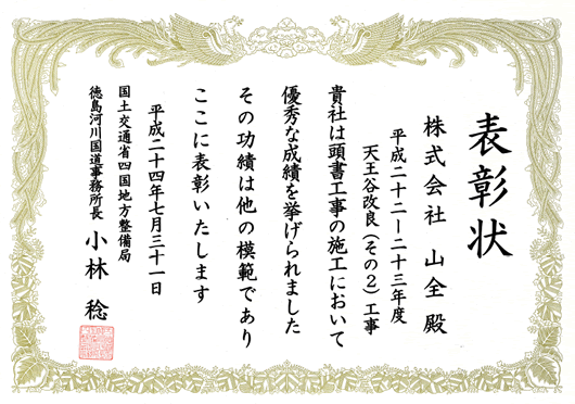 平成24年7月31日に、平成24年度国土交通関係功労者表彰として、四国地方整備局徳島河川国道事務所長様より優良工事表彰を授与されました。