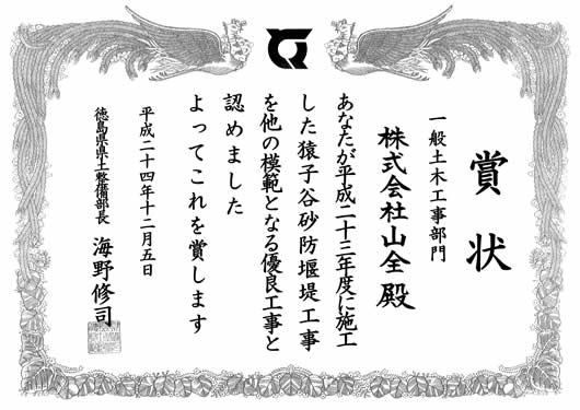 2012年12月5日に、徳島県庁において2012年度優良工事等表彰があり、弊社が平成23年度に施工した猿子谷砂防堰堤工事の現場が、優良工事として表彰されました。