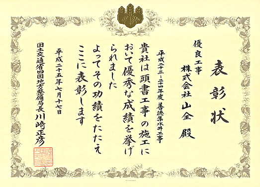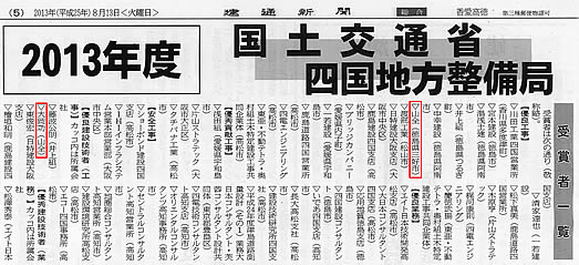 平成25年7月17日、国土交通省四国地方整備局にて国土交通行政関係功労者表彰があり、