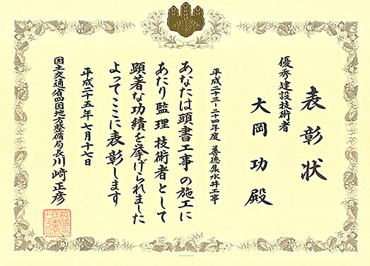 また、同工事で優秀建設技術者として大岡 功氏も表彰を受け、会社・技術者ともに大変名誉なことであります。