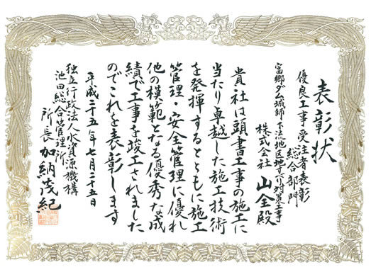 平成25年7月25日、独立行政法人水資源機構 池田総合管理所にて、平成25年度優良工事・業務表彰式があり、弊社が施工した富郷ダム城師下流地区地すべり対策工事の現場が、優良工事表彰(総合部門)として池田総合管理所長より表彰されました。