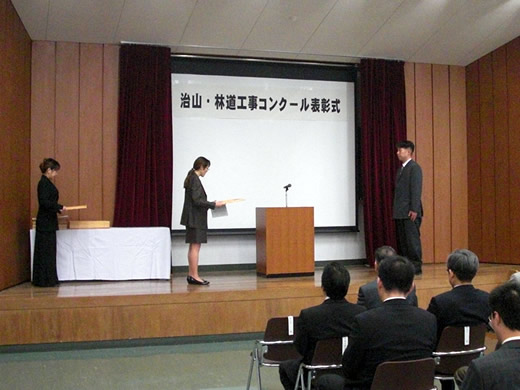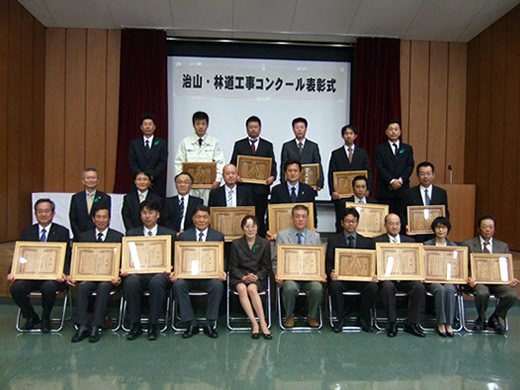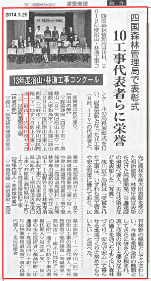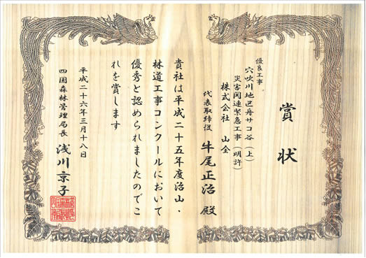 平成26年3月18日に、四国森林管理局において、2013年度治山・林道工事コンクールの局長表彰式が行われ、弊社が施工した「穴吹川地区舟サコ谷(上)災害関連緊急工事(明許)」の工事が、優良工事として表彰されました。