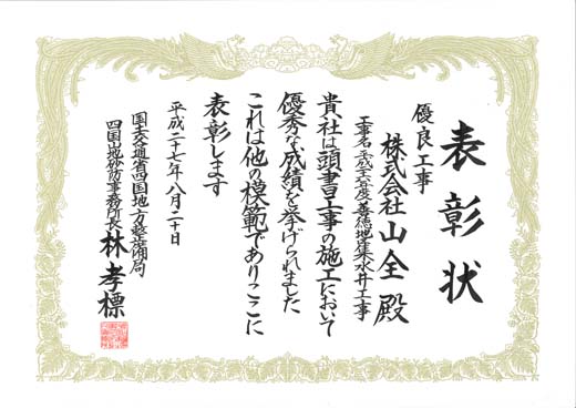 平成27年8月20日、国土交通省四国山地砂防事務所において、国土交通行政関係功労者表彰式があり、弊社が施工した「平成26年度 善徳地区集水井工事」の工事が優良工事として表彰されました。