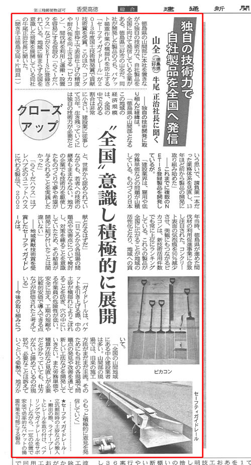 平成25年10月25日の建通新聞に「独自の技術力で自社製品を全国へ発進」というタイトルにて、クローズアップのコーナーに特集して頂きました。