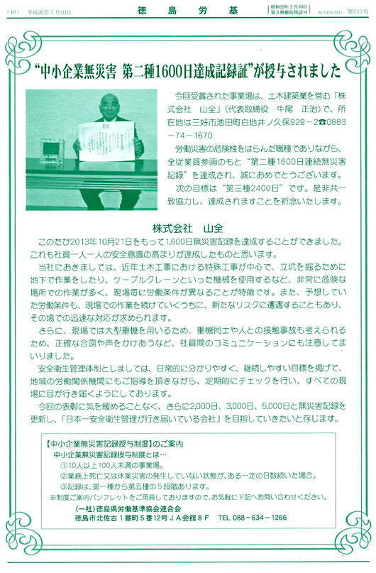 平成26年6月に「中小企業無災害 第二種1,600日達成記録証」の表彰を受け、徳島労基7月号にて、弊社の受賞感想や今後の目標についての記事が掲載されました。
