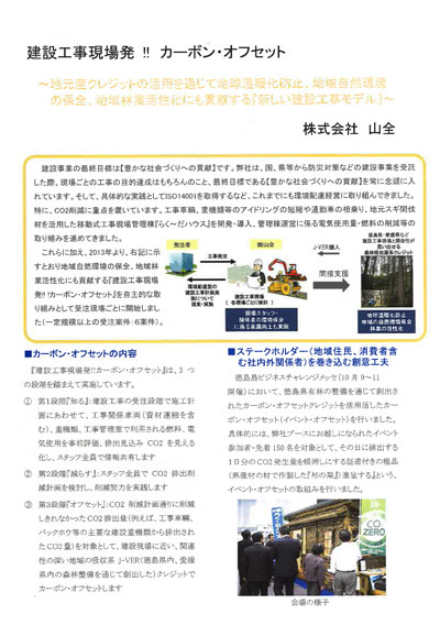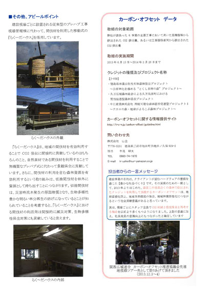 現場単位でのカーボン・オフセットの実施、徳島ビジネスチャレンジメッセでのイベント・オフセットの取り組み、らく~だハウスの活用事例など、いろんな取り組みを通じてカーボン・オフセットを実施し、環境貢献・社会貢献に役立てています。