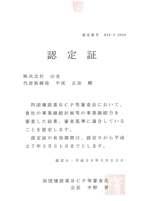 国土交通省 四国地方整備局からBCP認定をいただきました。