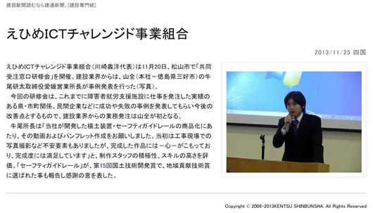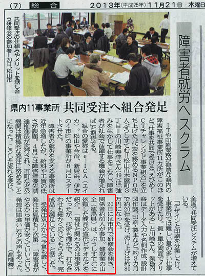 平成25年11月20日に、愛媛県身体障害者福祉センターにおいて、「えひめICTチャレンジド事業組合」が主催する共同受注窓口の研修会において、弊社の事例発表を行いました。
