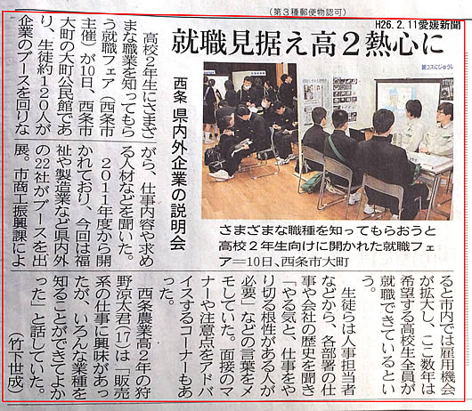 平成26年2月10日に、愛媛県西条市大町公民館にて、「平成25年度高校生対象就職フェア」に参加し、弊社の企業説明を行いました。