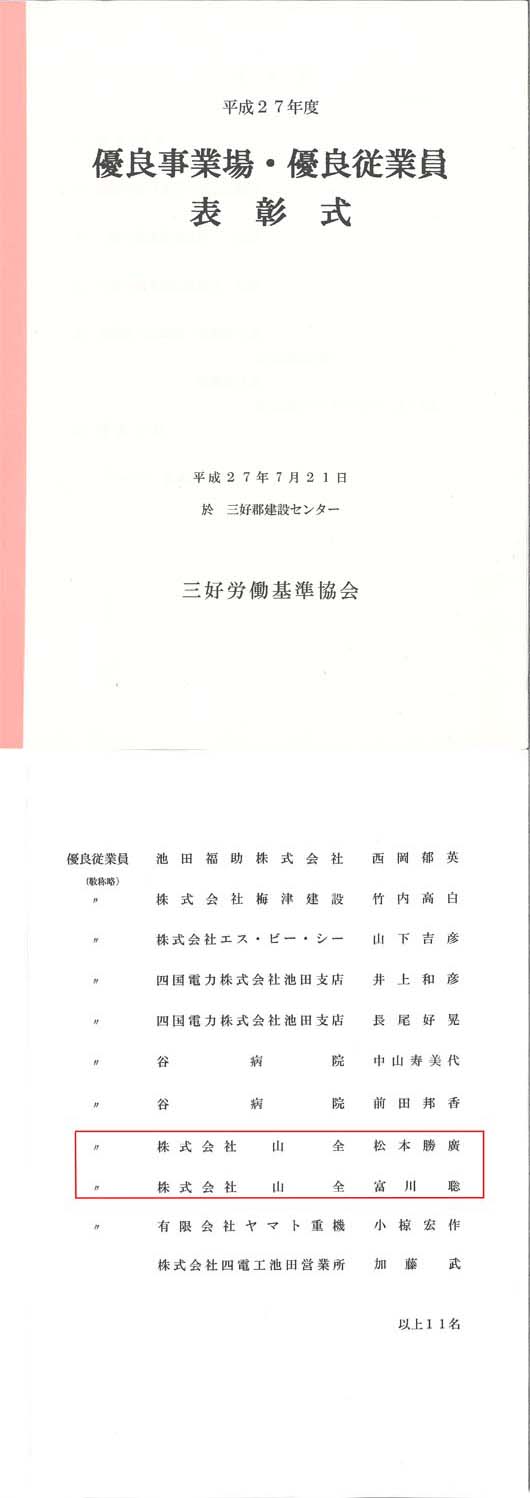 平成27年7月21日、三好郡建設センターにて、平成27年度優良事業場・優良従業員の表彰式があり、弊社の松本勝廣氏と富川聡氏が三好労働基準協会より表彰されました。