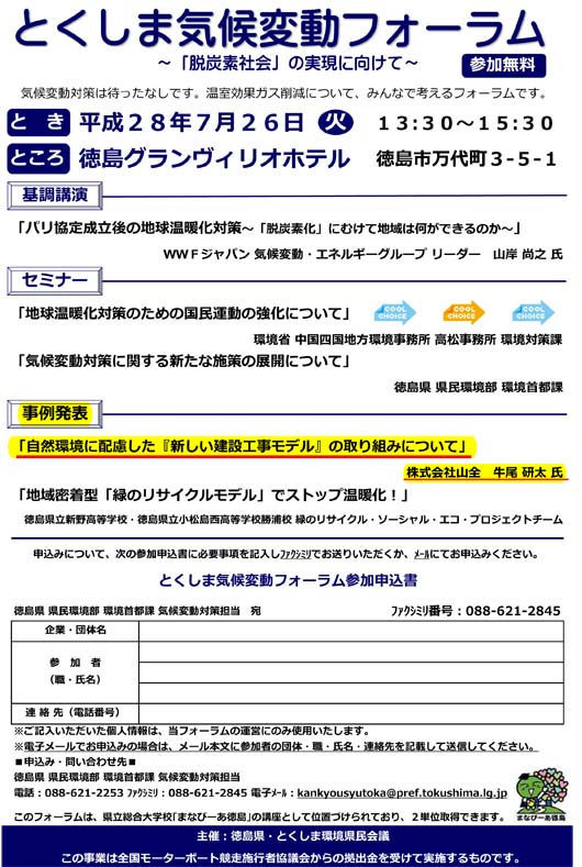 平成28年7月26日に徳島グランヴィリオホテルで「とくしま気候変動フォーラム」~「脱炭素社会」の実現に向けて~主催:徳島県・とくしま環境県民会議が開催されます。